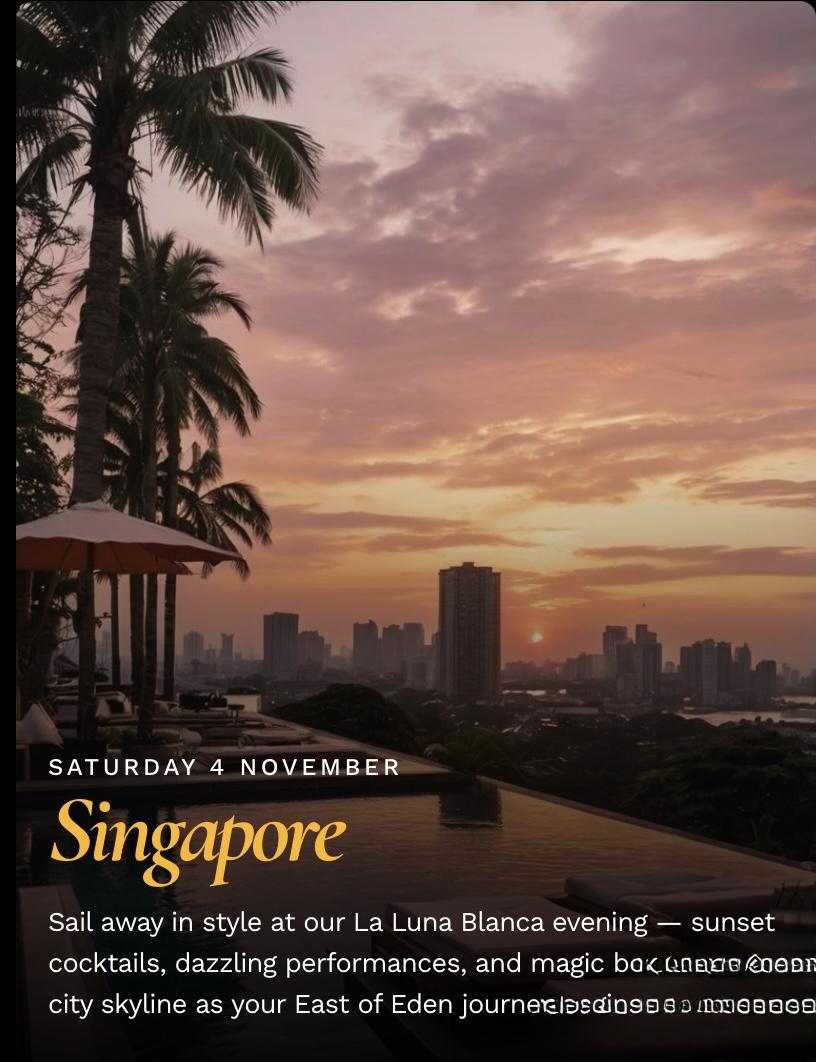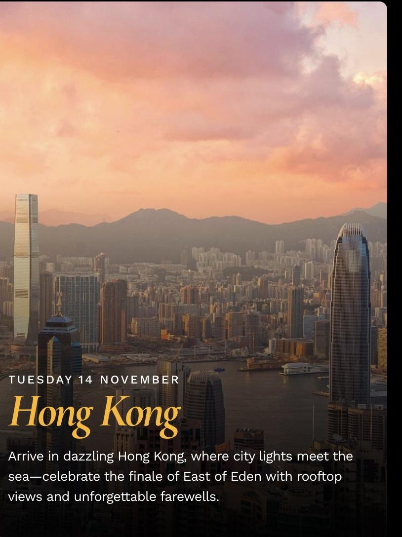 Sailing through some of Asia’s most breathtaking coastal destinations, East of Eden is where paradise meets temptation: turquoise waters, palm-lined shores, exotic cultures, and nights that feel like they were made for you.