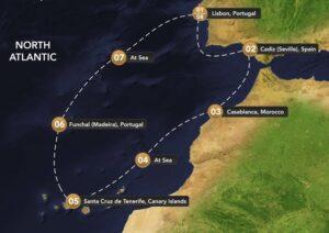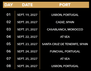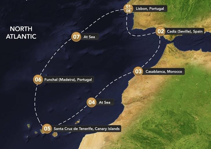 Sail a route once traced by poets, traders, and Moorish legends on the Desire Lisbon–Morocco Cruise 2027. From Lisbon to Cadiz, Casablanca, Santa Cruz de Tenerife, and Funchal—each port invites you to explore layers of beauty, culture, and sensual mystery.